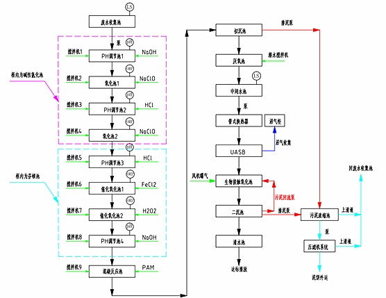污水先PH調(diào)節(jié)池,然后在經(jīng)過(guò)氧化池,這樣來(lái)回的重復(fù)幾個(gè)流程,在進(jìn)入PAM反應(yīng)池,然后經(jīng)過(guò)沉淀,使排放出去的水能夠達(dá)標(biāo)。其具體的流程圖如下。